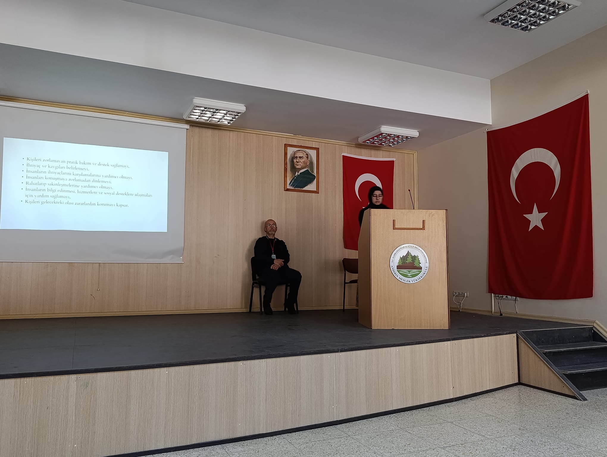 Andırın İlçe Sağlık Müdürlüğünde görev yapan Psikolog Elif İMAL, Andırın Meslek Yüksekokulunda “Psikolojik İlk Yardım ve İntihar Farkındalığı ve İntiharı Önleme” konulu bir konferans verdi.