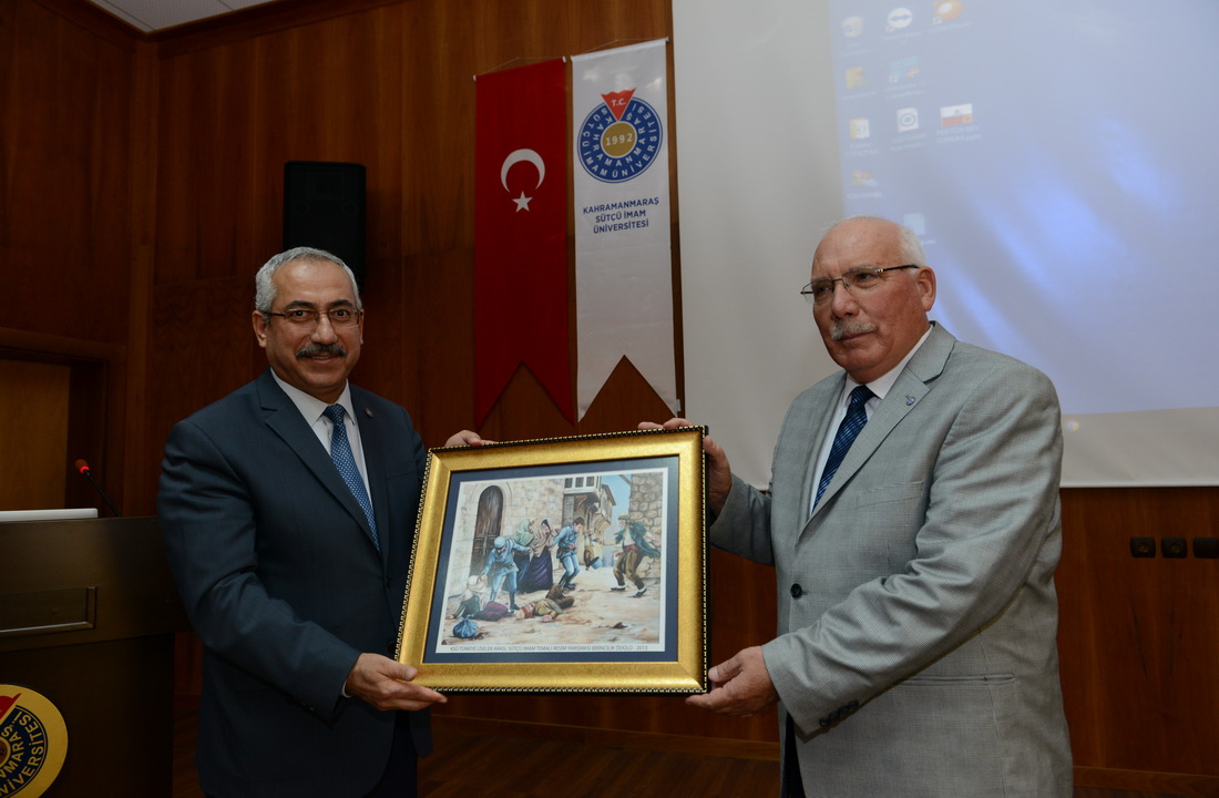 Tören sonunda Rektör Deveci tarafından Özçalık’a Maraş Milli Mücadelesinin en önemli dönüm noktalarından biri olan ‘Sütçü İmam Hadisesi’nin resmedildiği tablo hediye edildi.