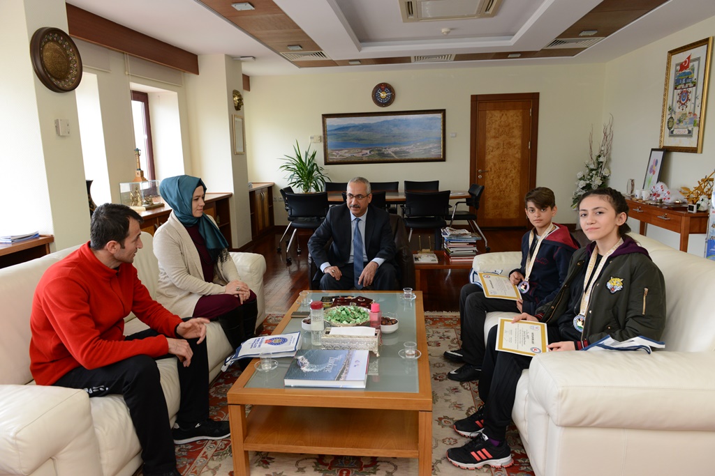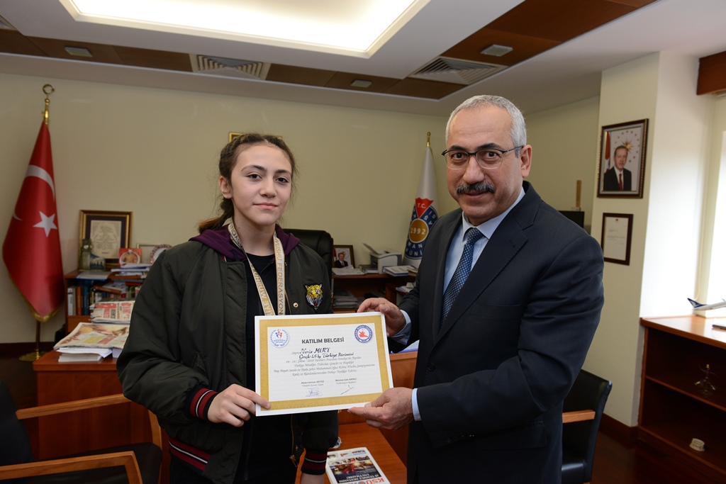 4-14 Şubat 2018 tarihleri arasında Antalya’da Şehit Muhammet Oğuz Kılıç anısına düzenlenen Türkiye Minikler, Yıldızlar, Gençler ve Büyükler Bay-Bayan Sanda ve Taolu Wushu Şampiyonasında genç bayanlar 45 kiloda Türkiye Şampiyonu olan Neris Mert, Yıldız Erkekler 35 kiloda Türkiye 3.’lüğü elde eden Semih Akpolat ve KSÜ Sosyal Yardımlaşma Spor Kulübü ve Mezunları Derneği Wushu Kungfu Takımı antrenörü Ahmet Gözükara’yı Rektörlük Makamında kabul eden Rektör Deveci, sporcuları tebrik ederek başarılar diledi.