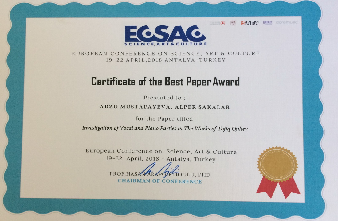 Üniversitemiz öğretim elemanları Öğr. Gör. Dr. Arzu Mustafayeva ve Öğr. Gör. Alper Şakalar birlikte katıldıkları, 19-22 Nisan 2018 tarihleri arasında Antalya’da düzenlenen Uluslararası Bilim, Sanat ve Kültür Sempozyumunda (ECSAC) gerçekleştirilen 500 sunum içerisinden “Investigation of Vocal And Piano Parties İn The Works Of Tofiq Quliev” isimli sunum ile birincilik ödülü elde ettiler.