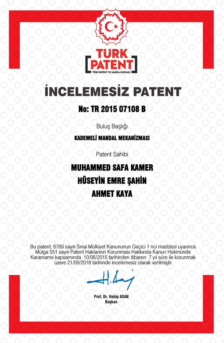 Prof. Dr. Ahmet Kaya, Öğr. Gör. Muhammed Safa Kamer ve Arş Gör. Hüseyin Emre Şahin’in Ortak Buluşu TÜRK PATENT Tarafından Tescillendi