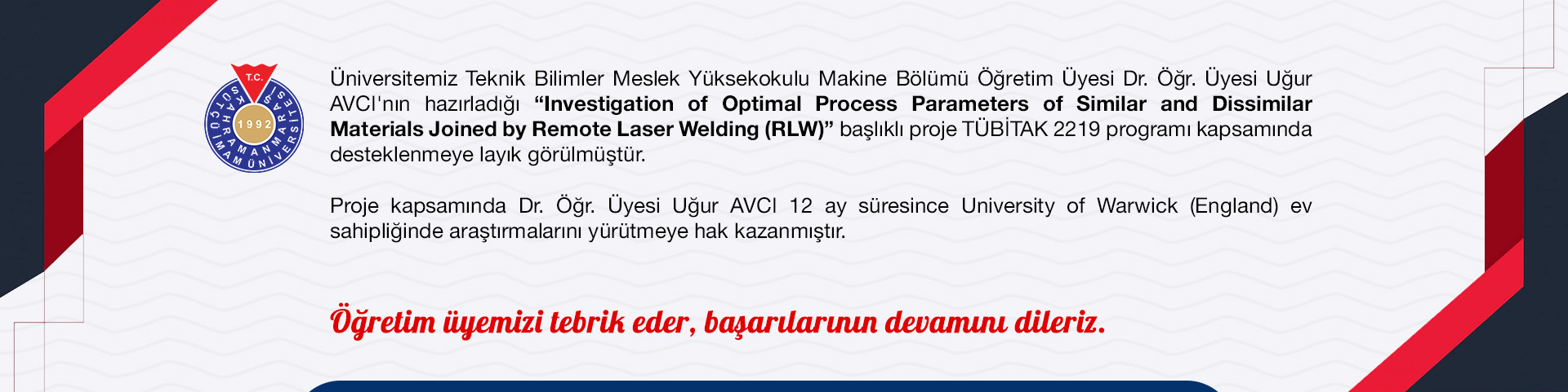 Investigation of Optimal Process Parameters of Similar and Dissimilar Materials Joined by Remote Laser Welding (RLW) başlıklı proje TÜBİTAK 2219 programı kapsamında desteklenmeye layık görülmüştür